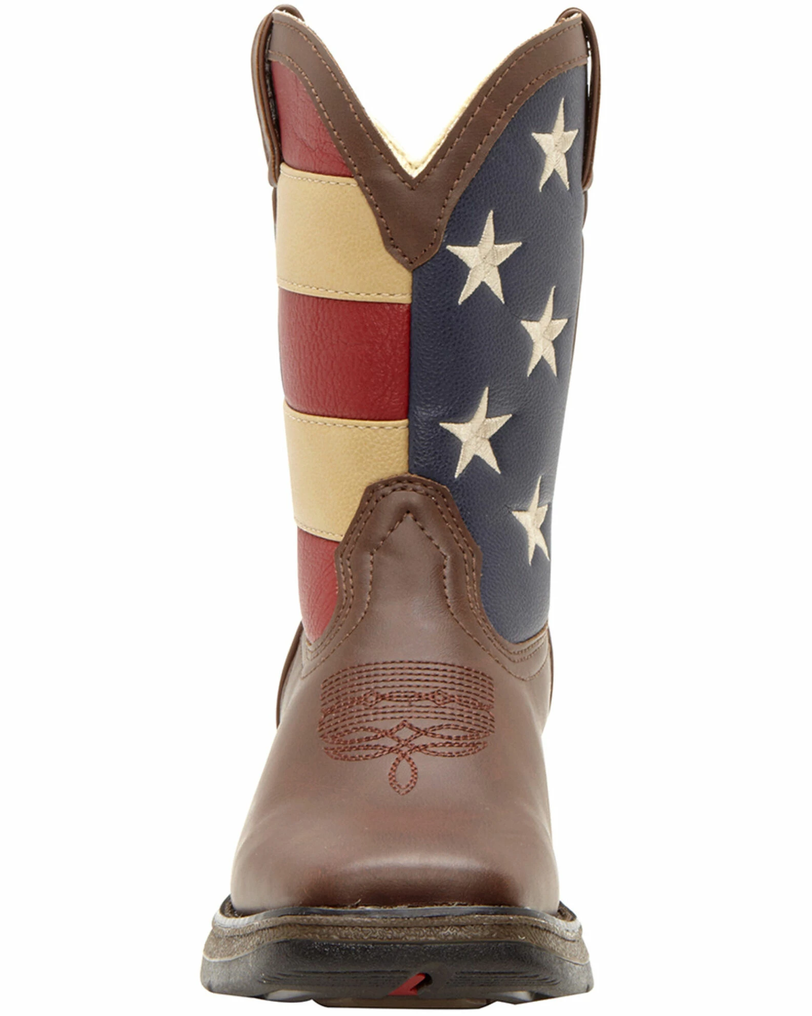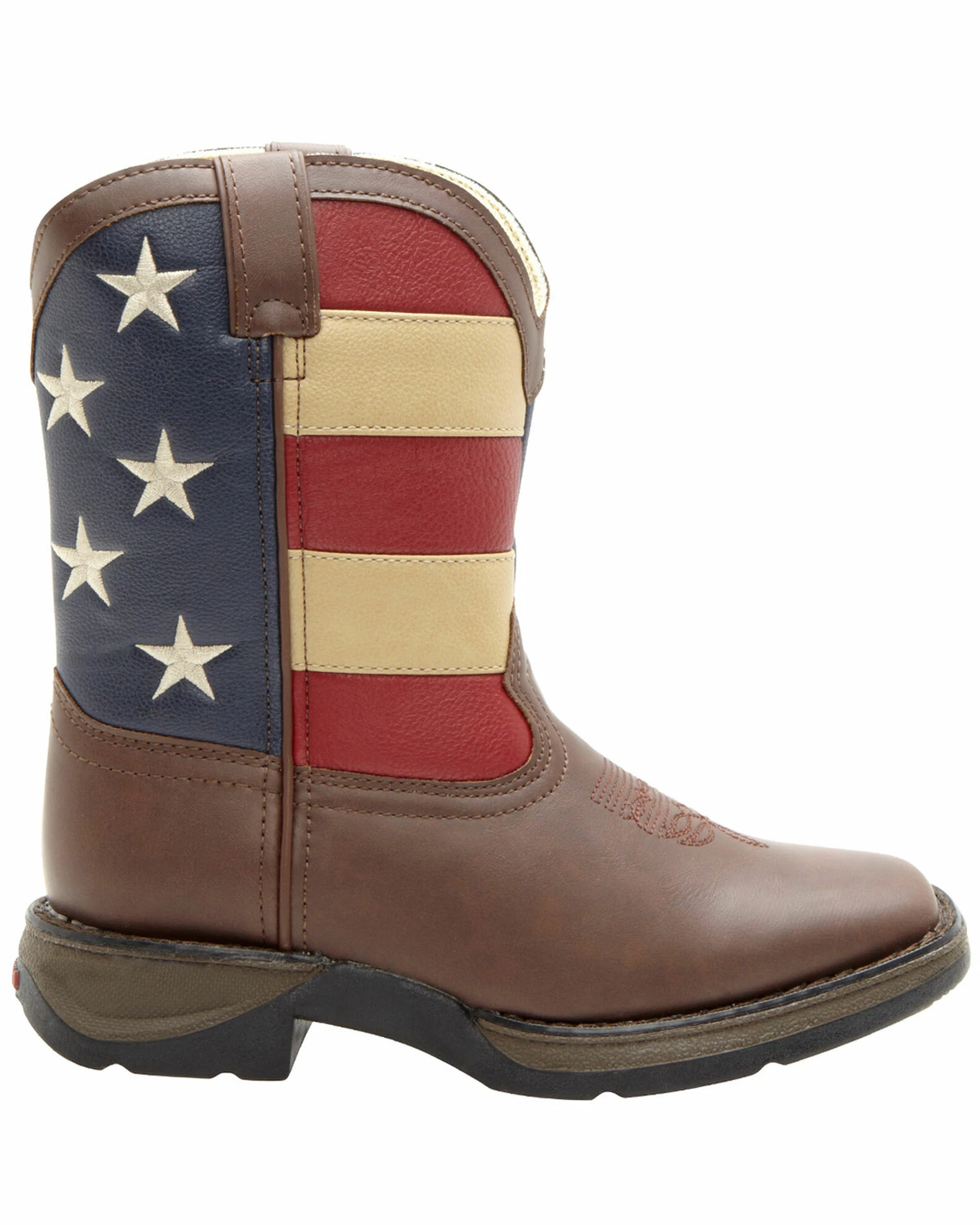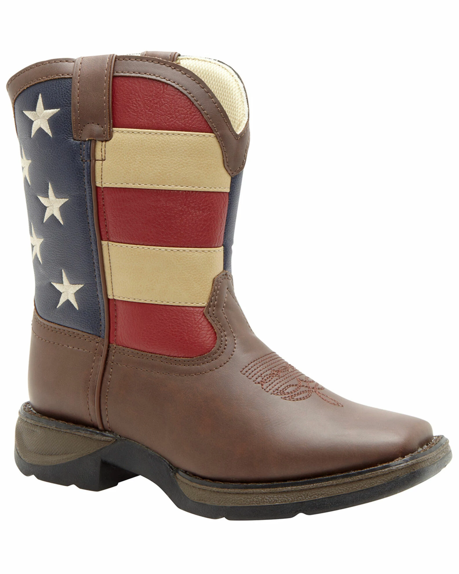 Show off your patriotism with these kid’s Durango flag western boots. These boots are great for riding or day to day wear. The synthetic leather is durable and easy to clean and care for. These boots will be perfect for your rough and tough cowboy or cowgirl. The flag design shaft gives these boots a fun and patriotic look that is sure to be a hit. Pair with jeans for a perfect outfit for a day at the ranch or a day at school.