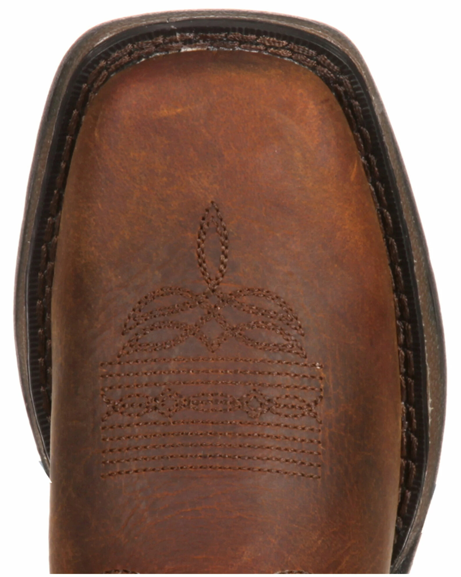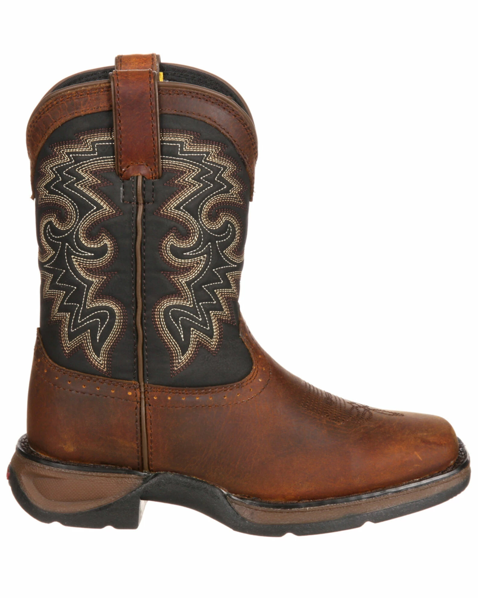 Give your baby western boots with a classic style. These western tan and midnight black full-grain leather boots have a cowboy heel and are eight inches tall. The boots have decorative stitching and soft mesh lining for comfort. Your baby will be the most stylish in town with this cute western boots!
