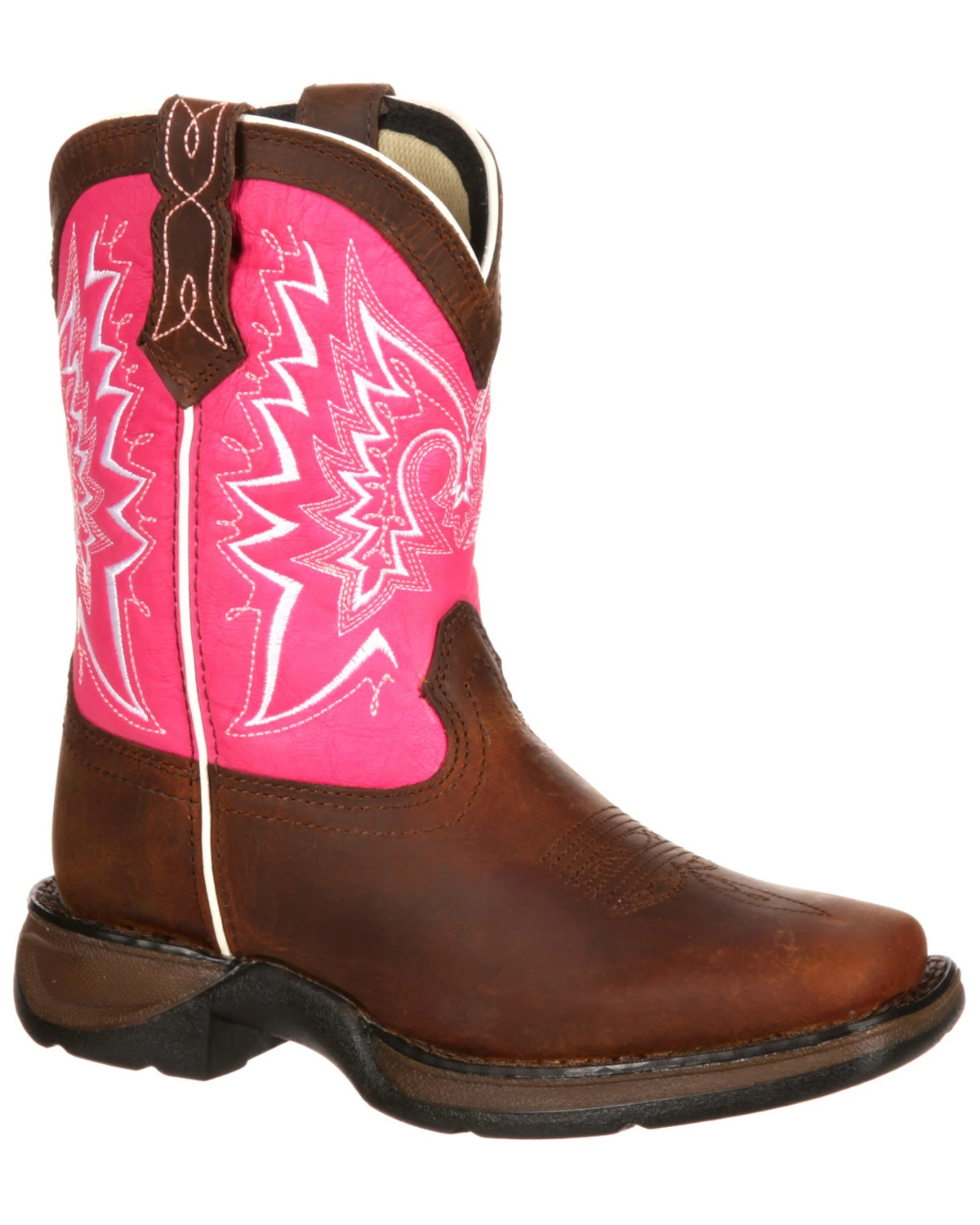 These bright pink western Boots are made for your girly cowgirl. These boots are made of full-grain leather, double-row welt stitch and a rubber outsole. Inside, a Cushion Flex insole makes these comfortable kids boots, too. Additional comfort comes from a soft mesh lining that provides ventilation and a steel shank for foot support. These western boots for babies have a traditional 1-inch cowboy heel. The foot is dark brown and topped with a pink shaft. The contrasting white embroidery on the shaft reinforces the traditional western look and stands out against the pink. The bright pink boots are topped with classic pull straps.